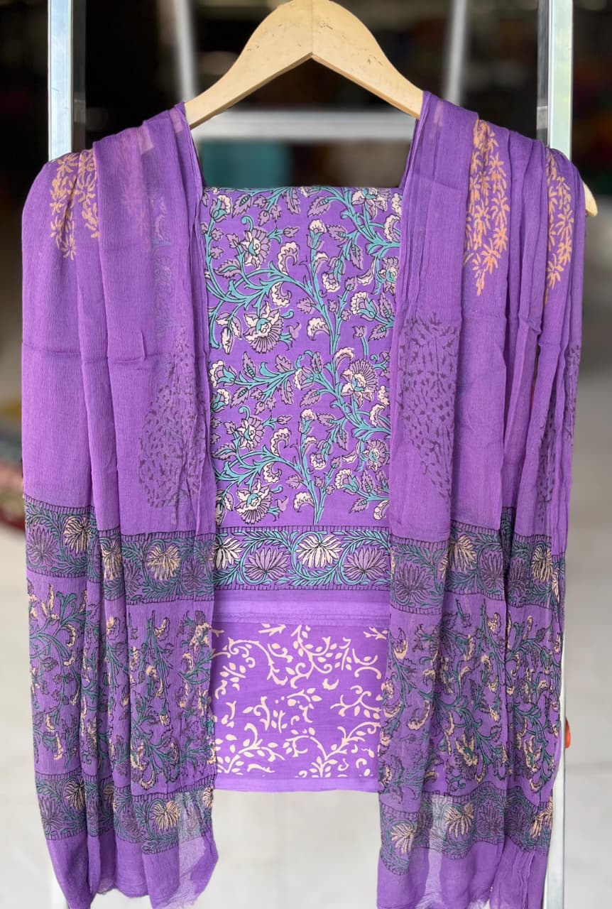 Crafted with precision, the Violet Floral Cascade Cotton Dress Material is a celebration of India's rich textile heritage. It features a delightful interplay of vibrant violet hues accented with turquoise blue and pale peach floral motifs. The intricate hand block printing and delicate embroidery evoke a sense of artisanal mastery, creating a fabric that feels as good as it looks.