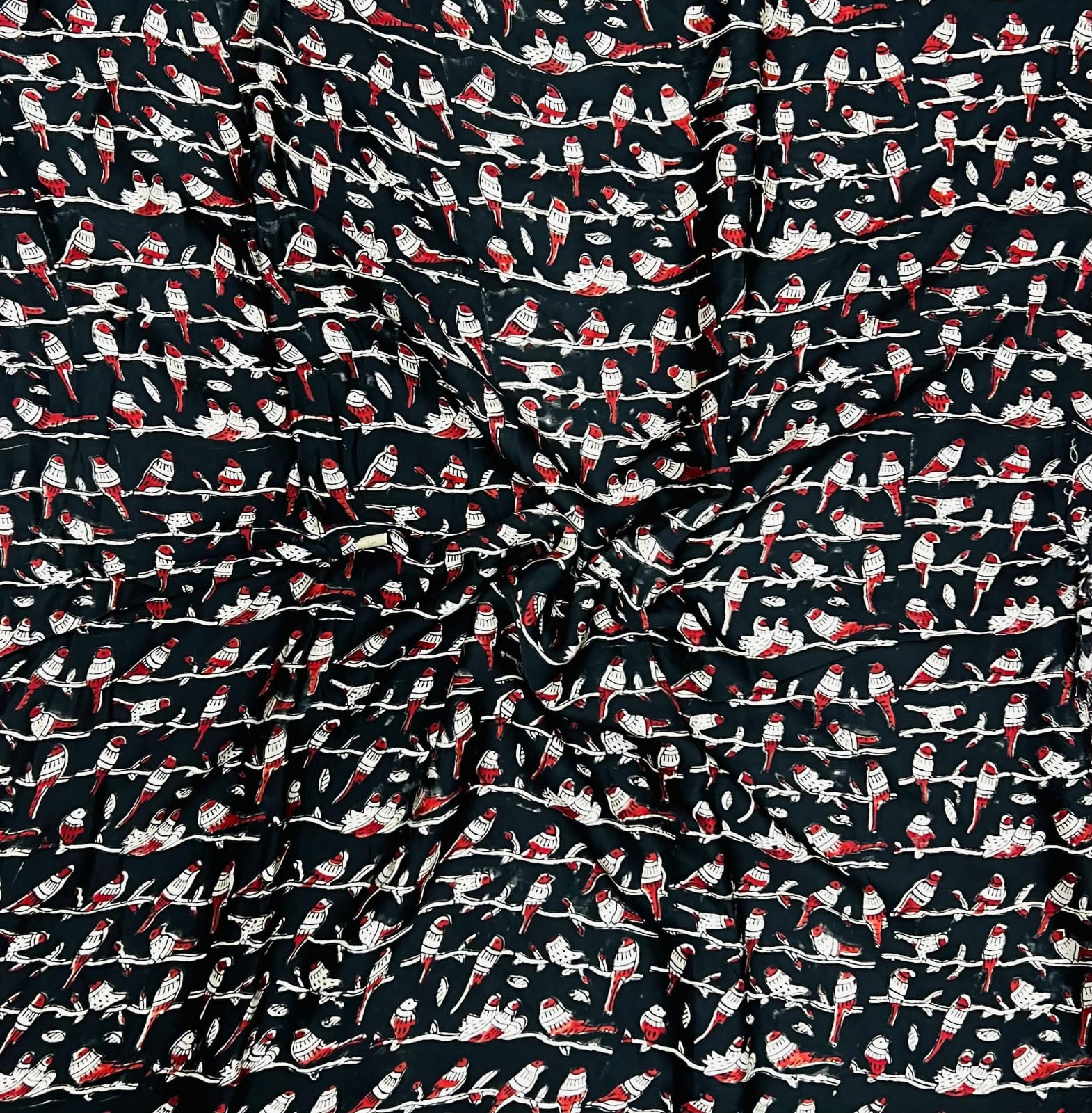 Step into a realm where whimsy and artistry elegantly intertwine with our Whimsical Birds Navy Ajrakh Hand Block Printed Fabric. Drawing inspiration from the vibrant tales of nature, this exquisite textile features delightful birds adorned with charming hats, perched on playful branches. The deep navy backdrop serves as the perfect canvas, allowing the intricacies of the design to shine through.