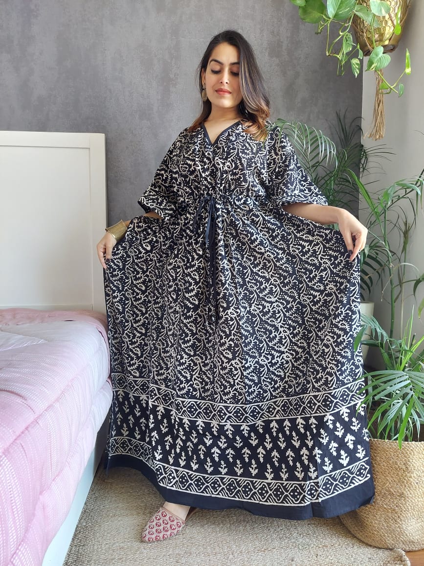 Indulge in the exquisite artistry of hand block printing with our White Floral Vine Maxi Dress. Crafted from 100% pure cotton, this free-size kaftan offers a relaxed fit and comfortable length of 52 inches. The V-neckline, wide sleeves, and detailed border pattern add a touch of elegance to its breezy design. Embrace the timeless charm and artisanal craftsmanship of Blockart's ethnic wear collection.
