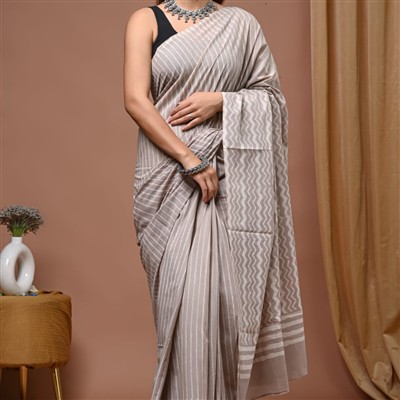 Indulge in the exquisite art of hand block printing with our Zigzag Stripe Mulmul Cotton Saree Set. Crafted from premium mulmul cotton, this saree features a unique zigzag stripe pattern on the pallu and vertical stripes on the main body. The set includes a matching printed blouse piece for a complete ethnic ensemble. Embrace comfort and style with this 5.5 meters saree that exudes traditional charm.